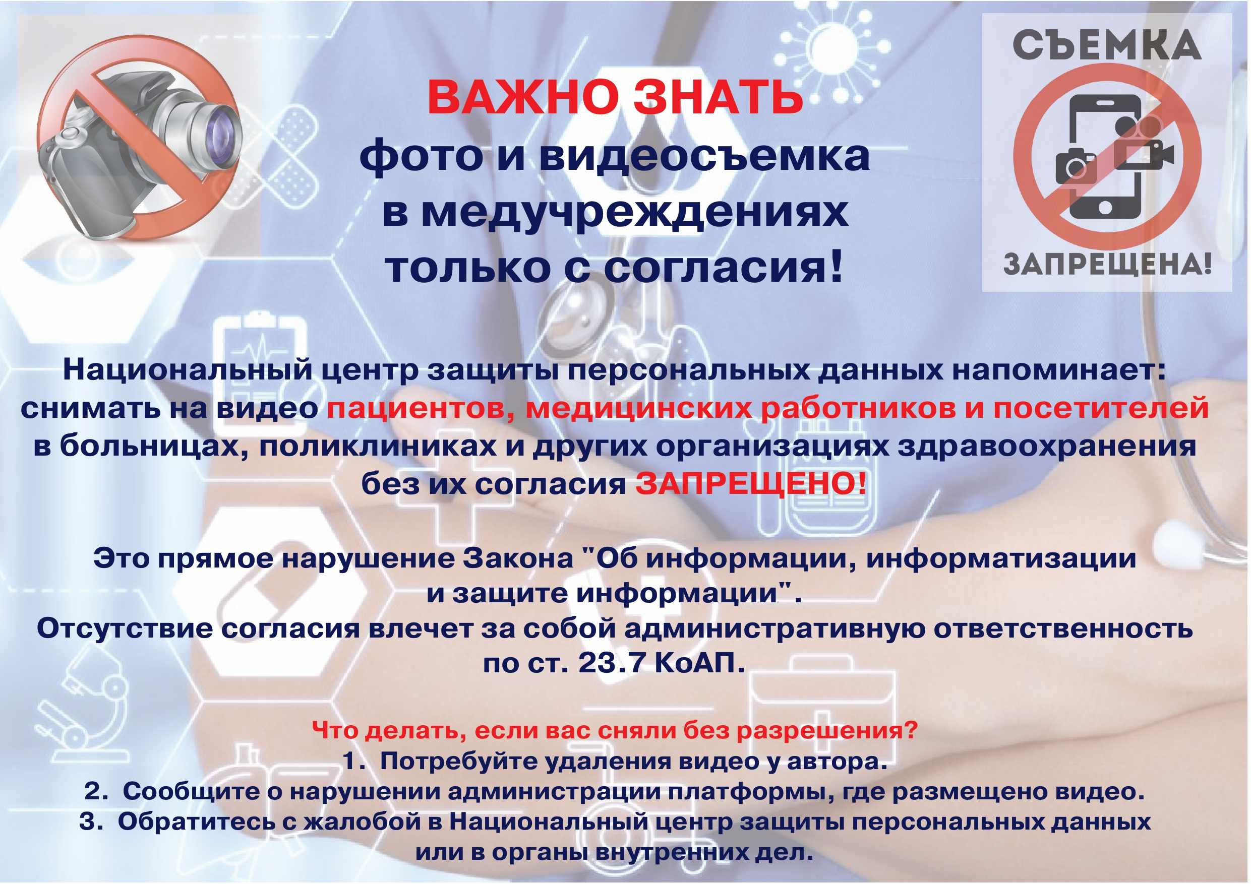 6.2. Аудиозапись, фото и видеосъемка на территории Учреждения сотрудниками, пациентами и иными третьими лицами без получения на то официального разрешения главного врача запрещены.